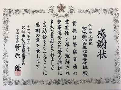 1月23日(木)に仙台南警察署から警察業務運営の円滑な推進に多大な貢献があったとして感謝状が贈呈されました。本校では日頃から交通安全に対する活動を行っています。みやぎ高校生サイクルサミット参加、街頭における自転車安全走行の呼びかけ、自転車用ヘルメットの効用に関するデモンストレーションの開催など生徒会や通学委員会を中心に活動してきました。これらのことが評価され今回の受賞になりました。
