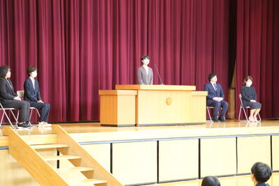2月27日(金)、2日後の卒業式に先立ち、皆勤賞受賞生徒への表彰、予餞式、同窓会入会式が行われました。1年生は卒業式に出席しないため、今年度の全校生徒が揃う最後の機会となりました。予餞式では、生徒会が作成してくれた動画を通して、卒業生の3年間の学校生活のさまざまな場面が映し出され、3年生は本校での思い出を振り返っていました。